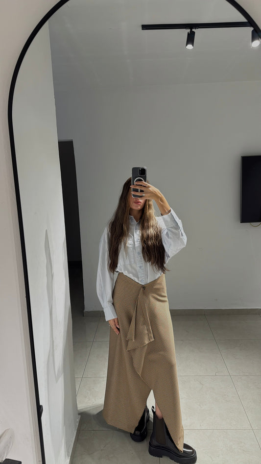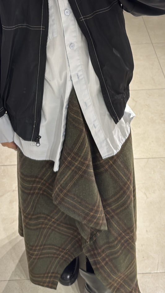 Sold Outחצאית אי סימטרית משובצת זית 100% צמר